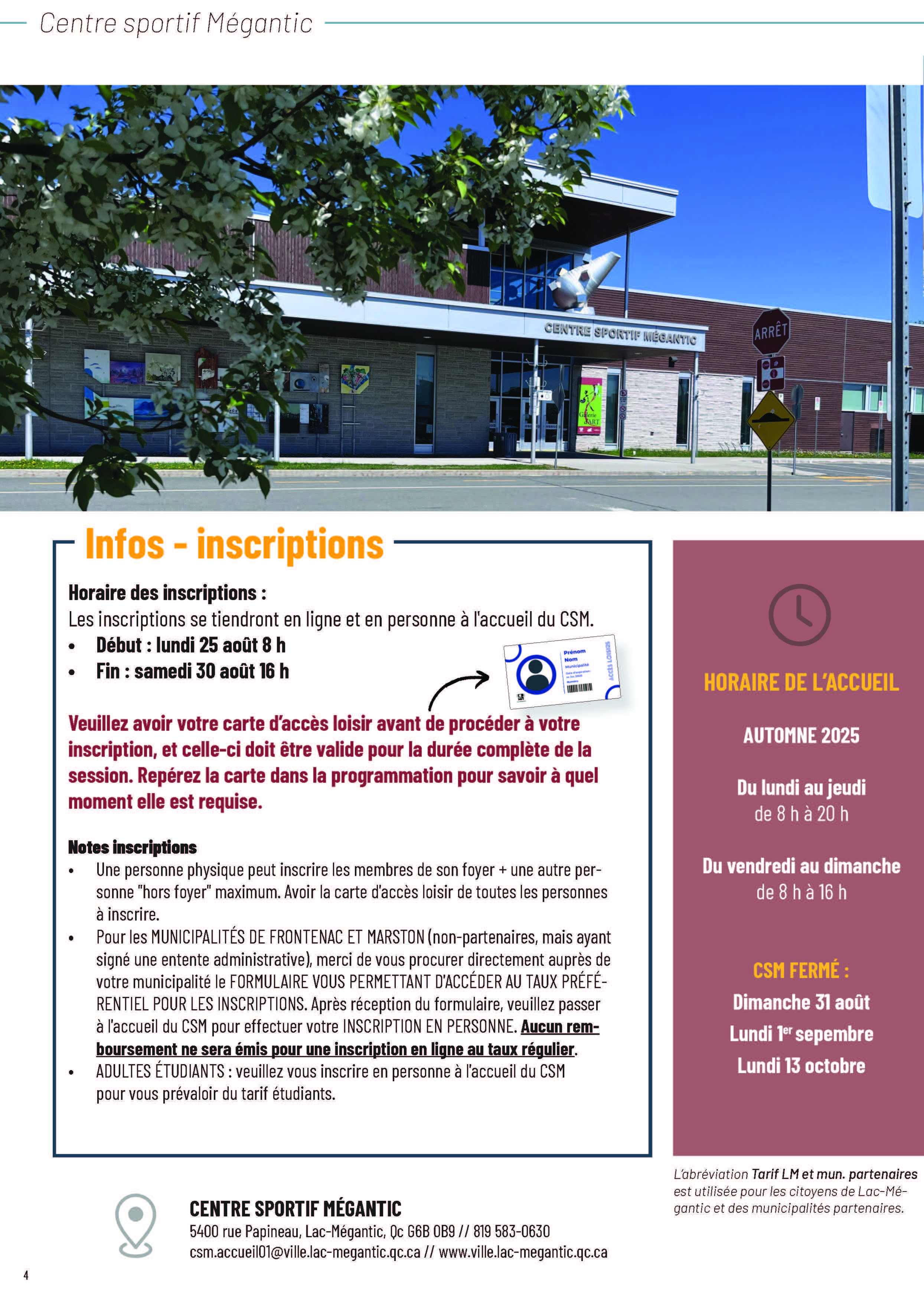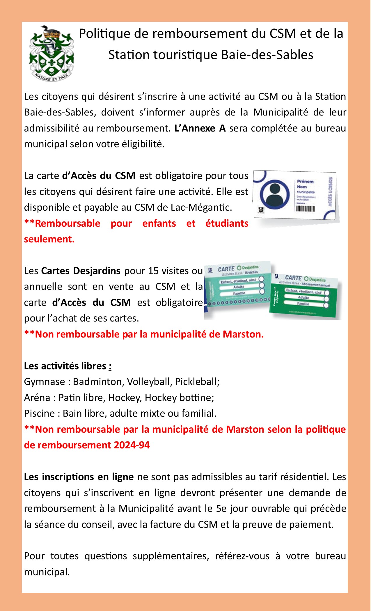 Les résidents de la Municipalité de Marston inscrits à une activité du Centre Sportif Mégantic et à la Station touristique Baie-des-Sables sont admissibles au programme de remboursement à 100 % de l’excédent imposé par la Ville de Lac-Mégantic lors de l’inscription. Il vaut cependant suivre certaines directives.